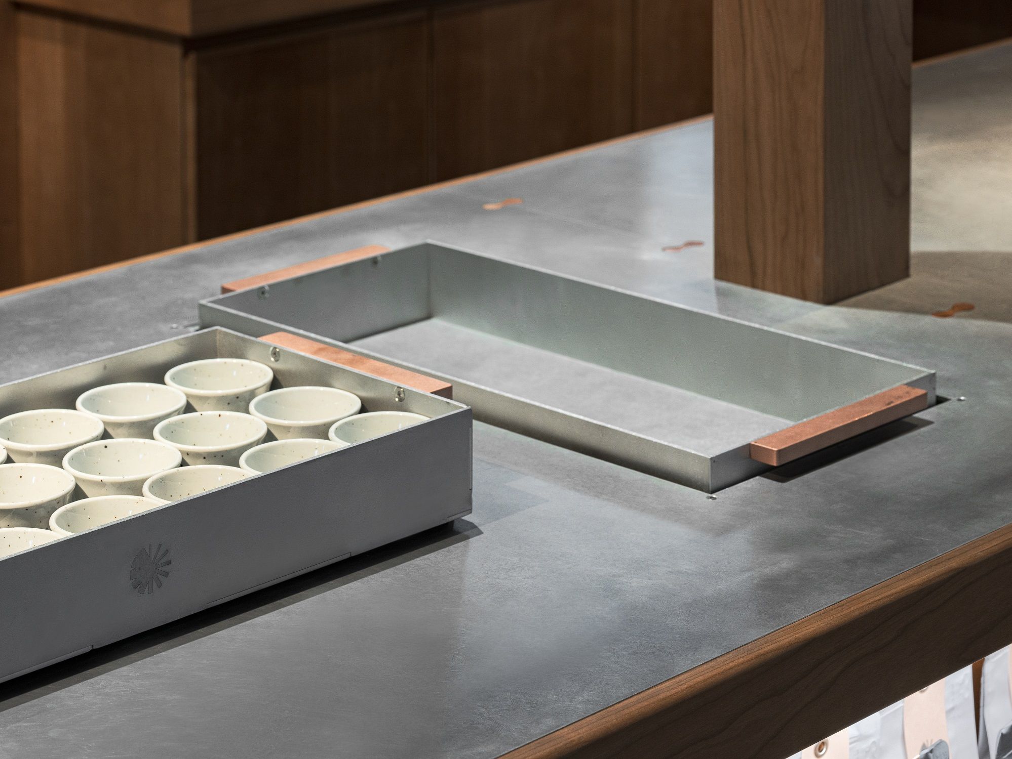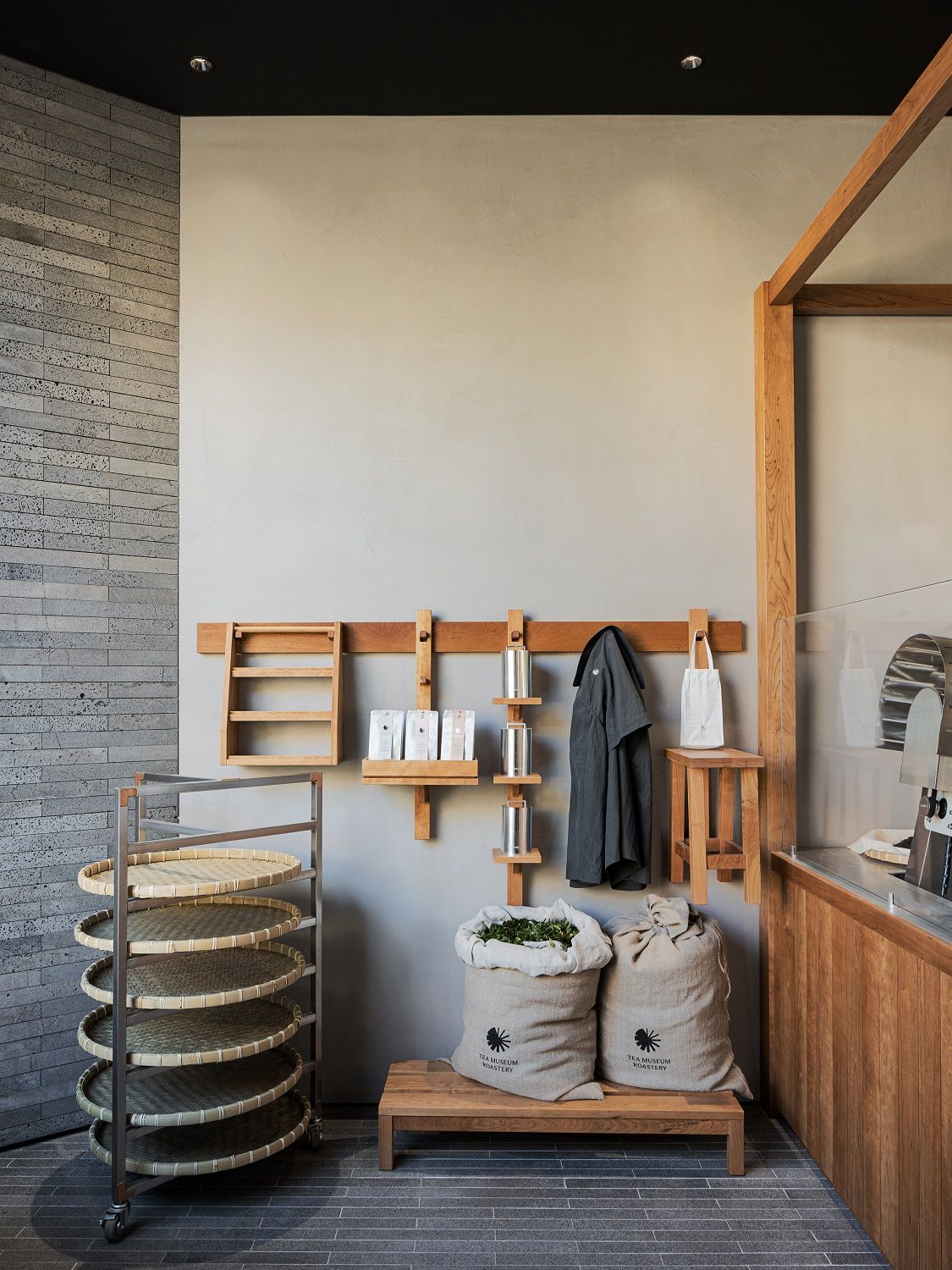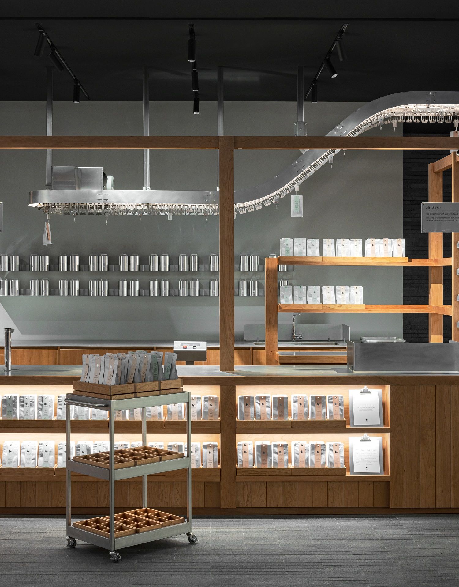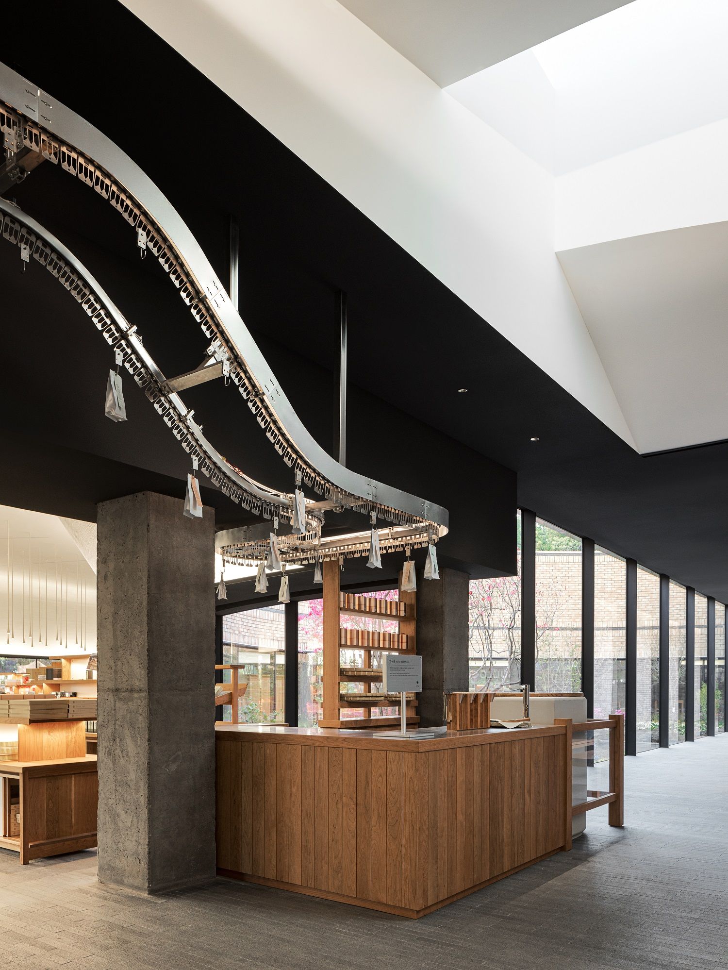 We wanted to create a space at the entrance that effectively explains the process of tea cultivation and its transformation into a product. We envisioned the entire space as a plaza, with four large pieces of furniture acting as independent architectural elements. Each space is designed to naturally lead from roasting, packaging, tasting, and ultimately to the sales area. To connect with the space where tea is hand-roasted, we incorporated a conveyor belt. The design of this space aims to guide visitors through the many steps involved in turning tea into a product, allowing them to experience each stage of labor involved in the process.